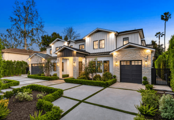 🌅 Detailed Description: A Modern Sunset Estate This image presents a high-definition photograph of a luxurious, contemporary two-story house situated in a picturesque landscape during the golden hour of sunset. Architectural Elegance and Structure The house is a prime example of modern residential architecture, characterized by a predominantly white stucco finish that provides a crisp, clean aesthetic.
